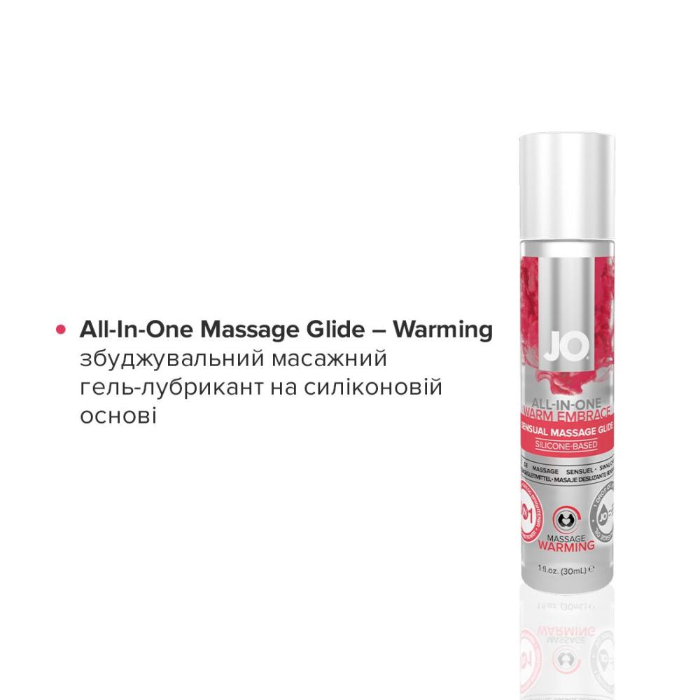 JO All-In-One Massage Glide — Warming — універсальний гель-змазка на силіконовій основі, що містить стимулювальні інгредієнти. Зігрівальні компоненти дарують додаткові приємні відчуття чуттєвого розслаблення. Гель-змазка має ідеальну консистенцію для масажу, оліїста структура без липкості та скочування створює неймовірну гладкість та шовковистість ковзання. А також робить нанесені на тіло татуювання яскравішими та зволожує шкіру. До складу гелю-змазки входить силікон найвищої якості.