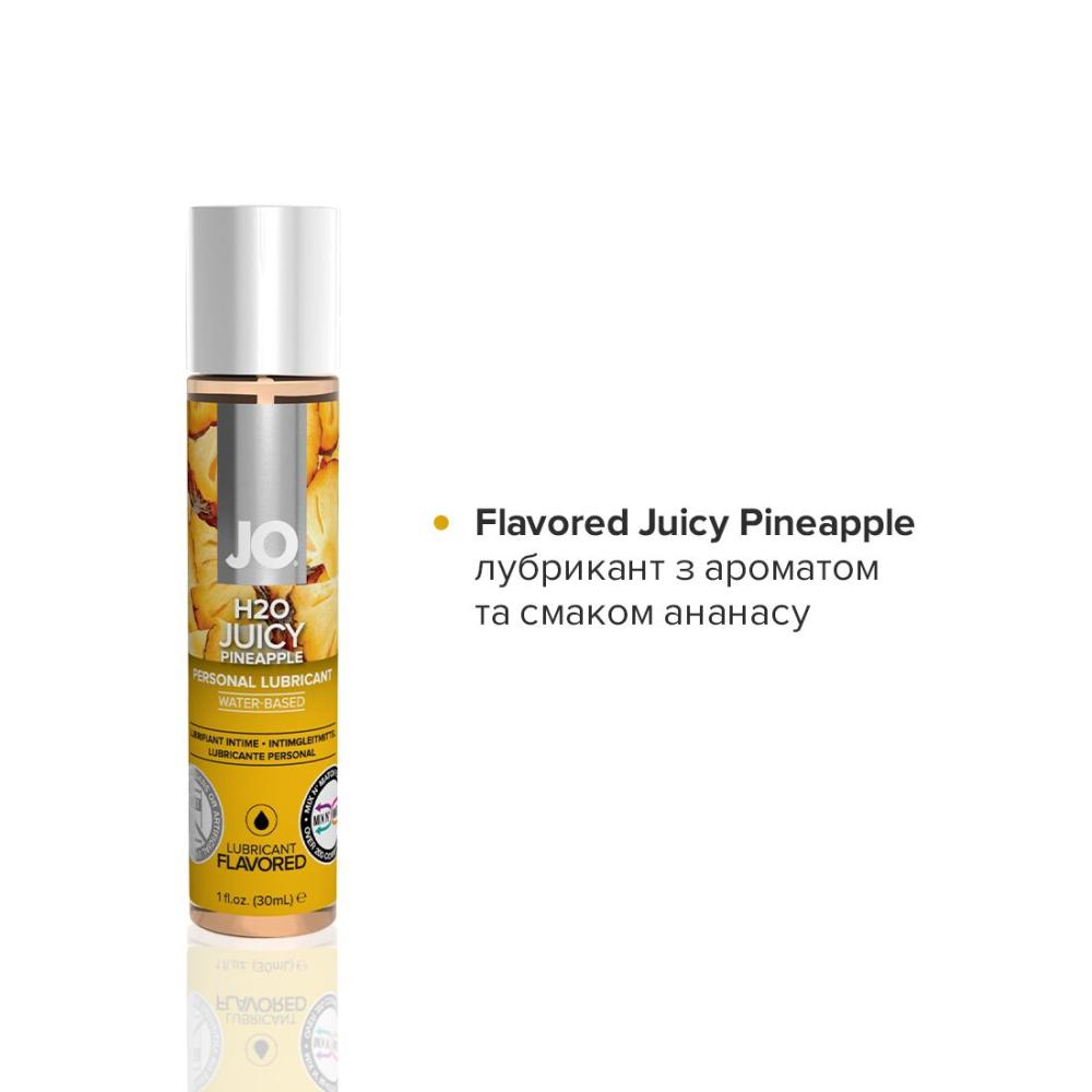 Jo Flavored Juicy Pineapple — pH-нейтральний інтимний лубрикант із насиченим ароматом ананаса. До складу входить гліцерин виключно рослинного походження. Усі інгредієнти найвищої якості та тільки натуральні харчові ароматизатори. У формулі лубриканту не міститься цукру, парабенів та пропіленгліколю. Забезпечує комфортне ніжне ковзання без липкості. Абсолютно безпечний для орального споживання, не має післясмаку.