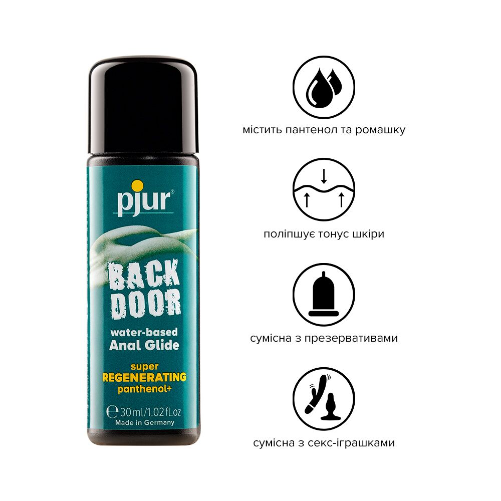 Лубрикант pjur Back Door Regenerating Anal Glide забезпечує тривале змащення, що робить його особливо придатним для боротьби з дискомфортними відчуттями під час анального сексу. Також підходить для використання з еротичними іграшками.
